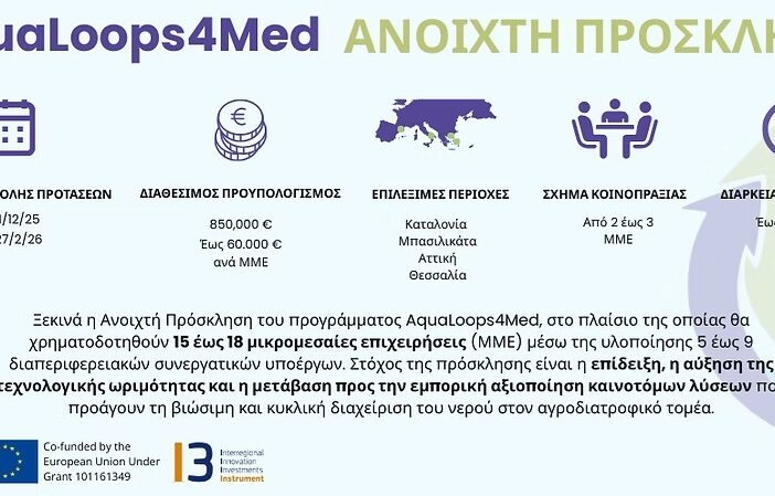 Στο πλαίσιο αυτό, ο Δήμος Λίμνης Πλαστήρα ανακοινώνει την δυνατότητα υποβολής προτάσεων χρηματοδότησης στο πλαίσιο Ανοικτής Πρόσκλησης του έργου AquaLoops4Med, με στόχο την υποστήριξη 15 έως 18 μικρομεσαίων επιχειρήσεων (ΜμΕ) μέσω 5 έως 9 διαπεριφερειακών συνεργατικών υποέργων. Τα υποέργα αυτά αποσκοπούν στην επίδειξη, την κλιμάκωση και την εμπορική αξιοποίηση καινοτόμων λύσεων για τη βιώσιμη και κυκλική διαχείριση του νερού στον αγροδιατροφικό τομέα.