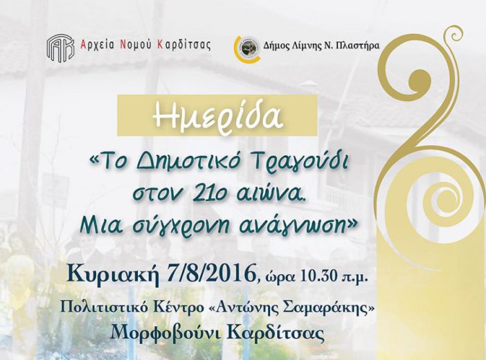 Με μεγάλη επιτυχία πραγματοποιήθηκε η ημερίδα για το Δημοτικό Τραγούδι με θέμα “Το Δημοτικό Τραγούδι στον 21ο αιώνα μια σύγχρονη ανάγνωση”, που συνδιοργάνωσαν τα ΓΑΚ – Αρχεία Ν. Καρδίτσας και ο Δήμος Λίμνης Πλαστήρα στο Μορφοβούνι την Κυριακή 7 Αυγούστου 2016. Εντυπωσιακή ήταν η συμμετοχή του κόσμου τόσο από το Μορφοβούνι όσο από την πόλη και τα χωριά της Καρδίτσας.