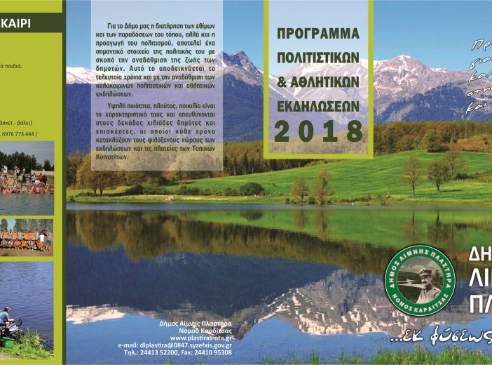 Ανοίγουμε λοιπόν την αυλαία «Πολιτιστικό και Αθλητικό καλοκαίρι 2018» και σας παρουσιάσουμε τη φετινή πολιτιστική μας πρόταση και καλούμε τόσο τους δημότες μας, όσο και τους επισκέπτες της περιοχής να στηρίξουν και να αγκαλιάσουν και αυτό το καλοκαιρινό πολιτιστικό ραντεβού,με ευχές για όμορφες βραδιές καλοκαιριού και μαγευτικές βραδιές πολιτισμού.